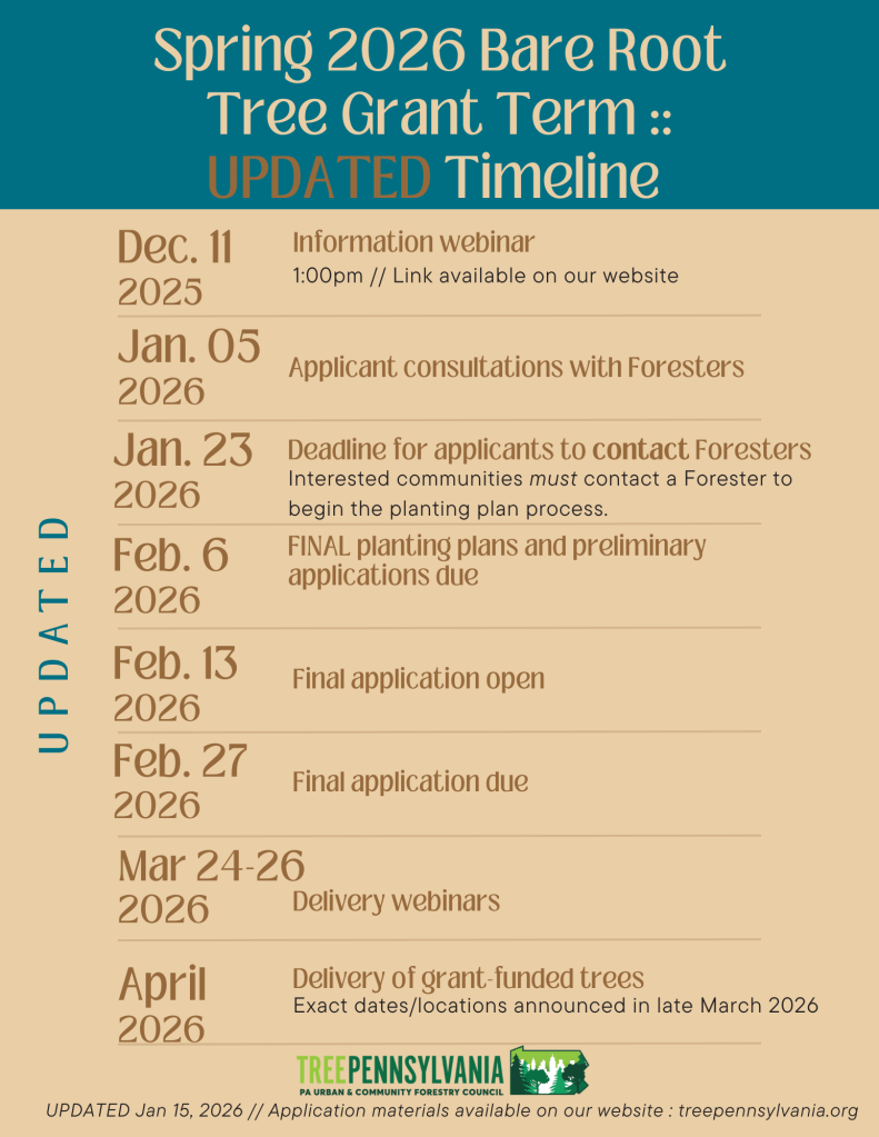 We have updated the timeline for the Spring 2026 Bare Root Tree Grant term. We are asking all communities to read all materials provided to minimize confusion. Thank you for your patience as our staff is absent on medical leave. Application materials for the Spring 2026 Bare Root Tree Grant term are now available on our Bare Root Tree Grant Program page.